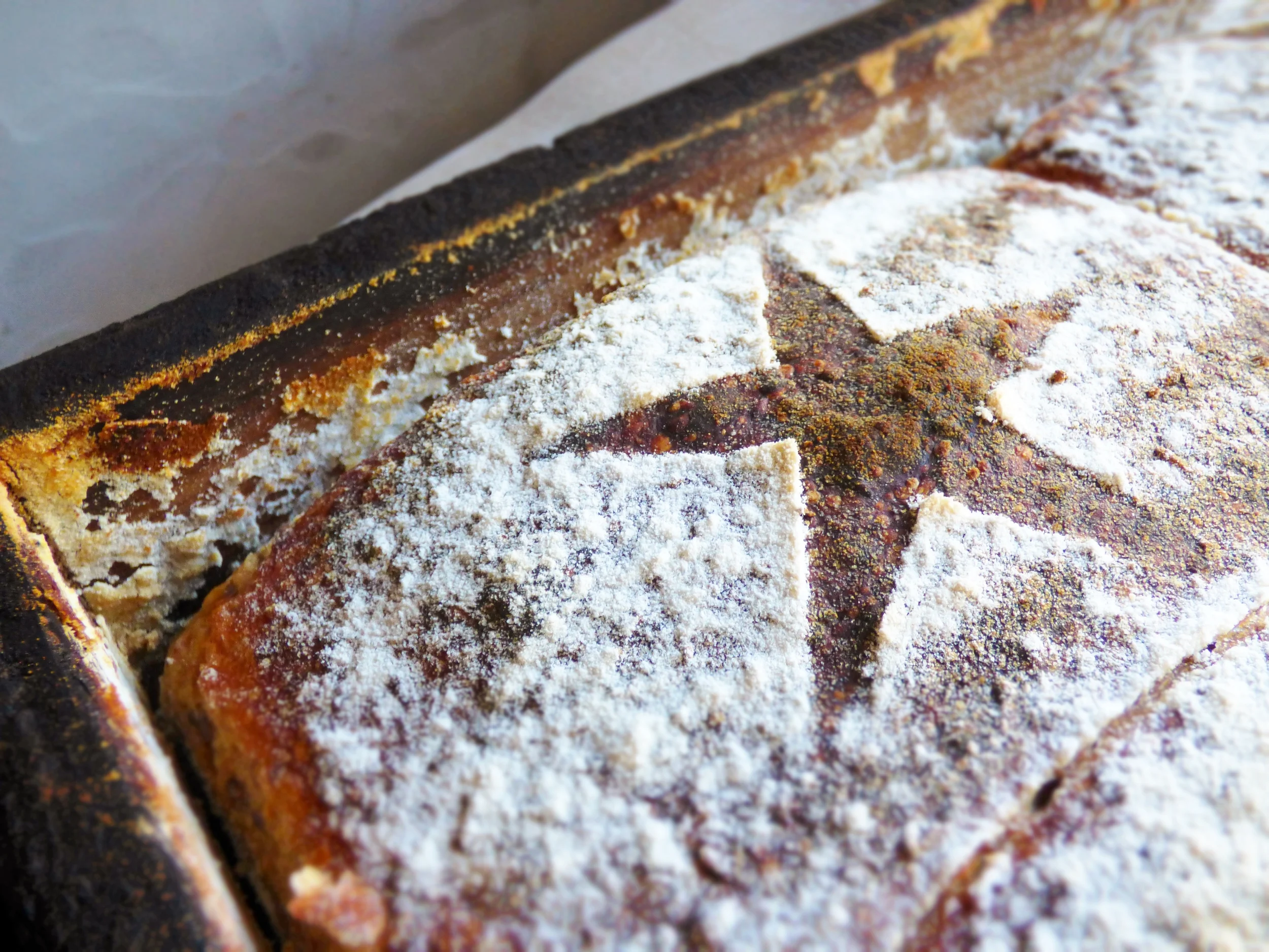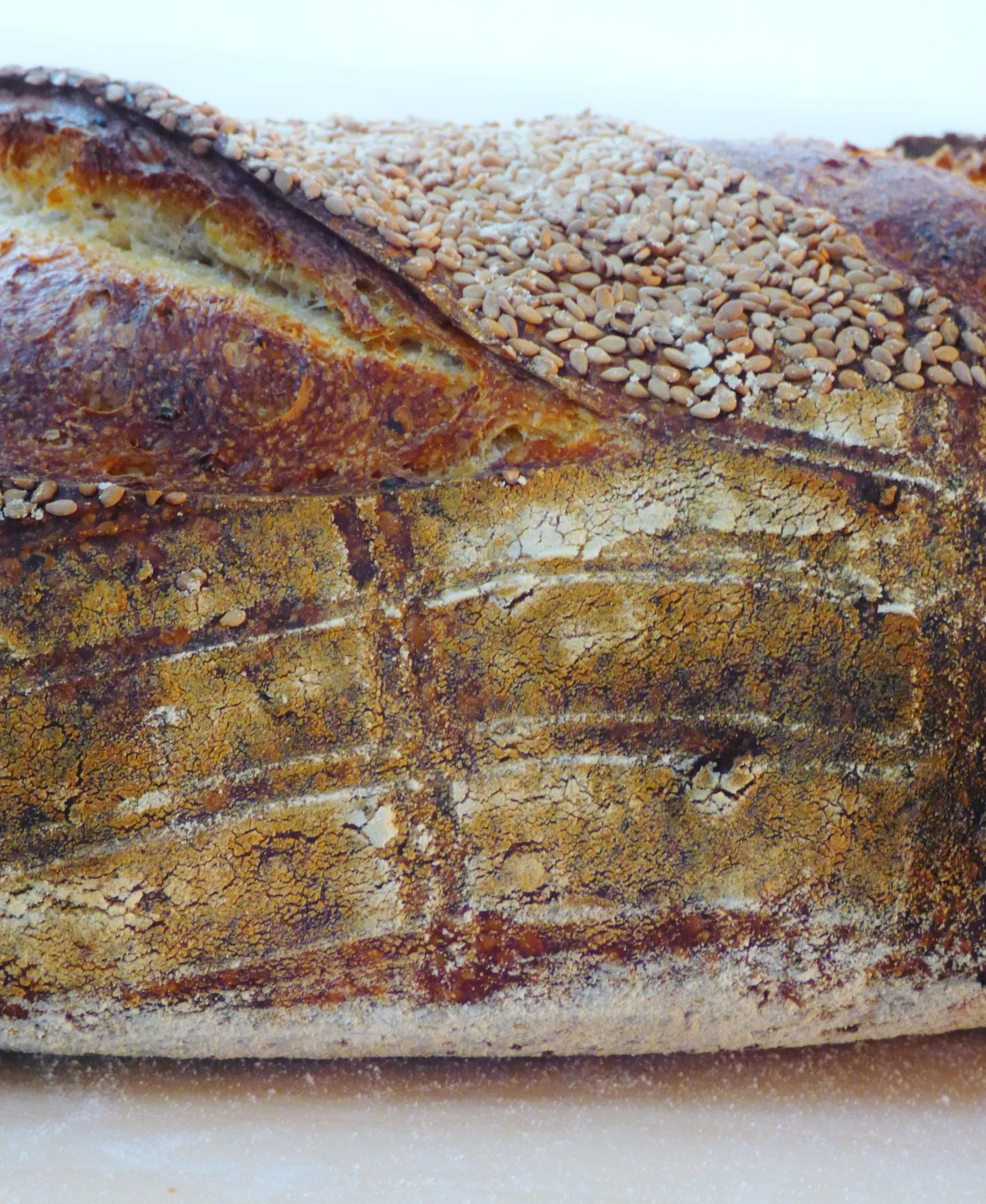 Sesame Sourdough: The everyday wholesome-but-not-heavy bread we built our reputation on. Sifted and whole wheat flours, cracked rye, sea salt, culture, sesame seeds on top.